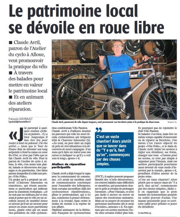 Ce moment, sous la houlette de Claude Avril de l’Atelier du Cyclo situé à Alloue, nous permettra également de discuter de la préparation d’une future sortie vélo découverte en Charente Limousine.