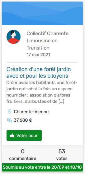 VOTER POUR LE PROJET : du 20 septembre au 18 octobre, il est possible de voter pour financer ce projet dans le cadre du budget participatif de la Charente. Rechercher sur le site Internet budgetparticipatif16.lacharente.fr/ le N° 160 : Création d’une forêt jardin avec et pour les citoyens